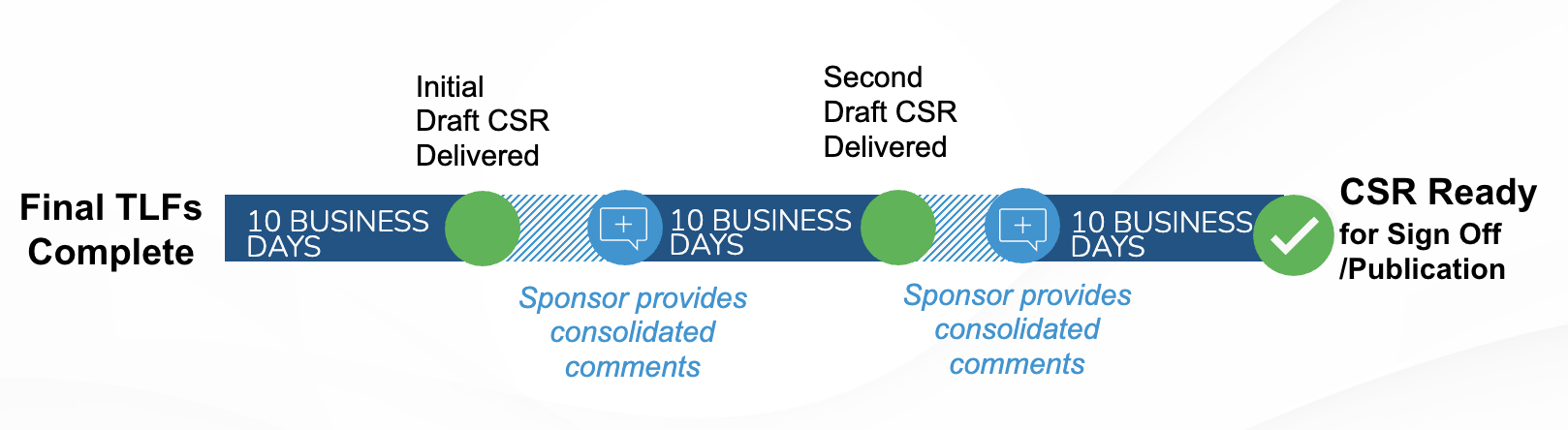 PharPoint’s standard CSR delivery timeline is 40 business days, assuming two rounds of 5-day sponsor review.